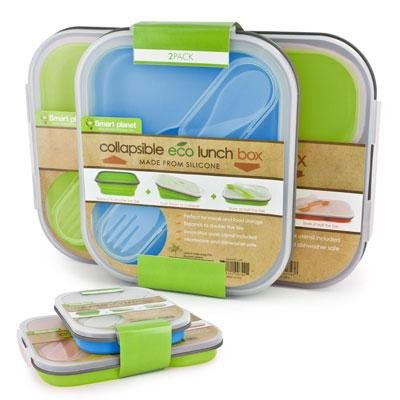 Smart Planet Eco Silicone Collapsible Lunch Box Set. Set includes 1 large with 3 compartements and 1 small with 1 compartment, 1 in blue and 1 in green. Each silicone lunch box compresses to 1/3 of its size so it is Easy to Carry and Store. Each includes a Two-Sided Spork that Snaps into the Lid.