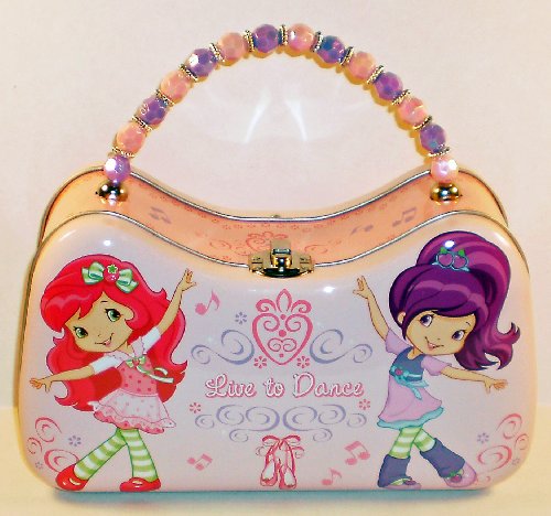 Scoop-style tin purse featuring Strawberry Shortcake with her pal Plum Pudding and the text "Live to Dance." Tin Box Company printing inks comply with U.S. Consumer Product Safety Commission 16 CFR 1303 Ban of Lead Containing Paint and Certain Consumer Products Bearing Lead Containing Paint. Product is tested and is in compliance with the new Childrens' Product Safety Information Act standards in effect as of Aug 14, 2009. Please also note that all Tin Box Company products are naturally PVC-Free and BPA-Free.