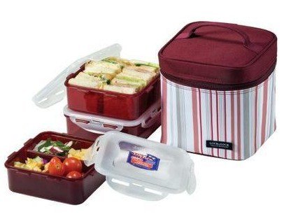 - Set includes one 3.3 C container, one 3.3 C container with dividers, one 4.1 C container and insulated burgundy striped lunch box.