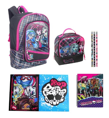 This limited edition Monster High 16" Monster Peek Backpack & ULTIMATE Back to School Set includes Monster High Zipper Sisters Insulated Lunch Tote, 2 Monster High Folders, 1 Monster High Spiral (styles may vary), and 3 Monster High Pencils! This is the Ultimate Monster High Back to School set!The Monster High 16 inch Monster Peek Backpack - Black and Pink features:Black bag displays a lenticular image of your favorite Monster High characters, along with plaid and metallic pink accents; A large zip compartment and 2 front zip pockets are perfect for stashing your stuff; ; Padded back and adjustable straps for comfy carrying; Top loop for easy hanging;Durable fabric and lining hold up for extended use; Dimensions: 16 x 12 x 5 inchesThe Monster High Zipper Sisters Insulated Lunch Tote - Black and Pink features: Two zippered compartments with a carry handle; Use it to take a healthy lunch to school; Made from durable fabric; Black, blue, and pink characters on the front are accented with plaid background; Fully insulated single compartment; Dimensions: 8 x 8 x 4 inches