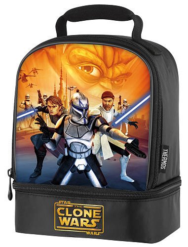 Clone Wars Dual Compartment Lunch box. Lunch box measures 9" x 6-3/4" x 4-1/4". Canvas structure with vinyl image of Anakin, Obi-Wan Kenobi, Yoda. Lower compartment zips around and holds sandwich or snacks. Upper compartment is larger and can hold sandwich, snacks, fruit, and drink. Completely insulated and wipes clean easily. Soft-grip carrying handle.