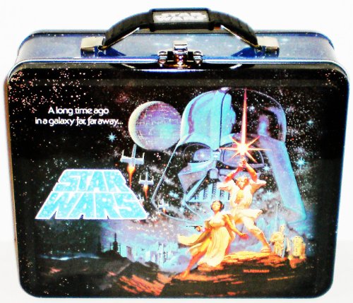 Metal lunch box/ carry-all featuring a scene from Star Wars and the text "A long time ago in a galaxy far, far, away..." Great for school supplies too!Tin Box Company printing inks comply with U.S. Consumer Product Safety Commission 16 CFR 1303 Ban of Lead Containing Paint and Certain Consumer Products Bearing Lead Containing Paint. Product is tested and is in compliance with the new Childrens' Product Safety Information Act standards in effect as of Aug 14, 2009. Please also note that all Tin Box Company products are naturally PVC-Free and BPA-Free.
