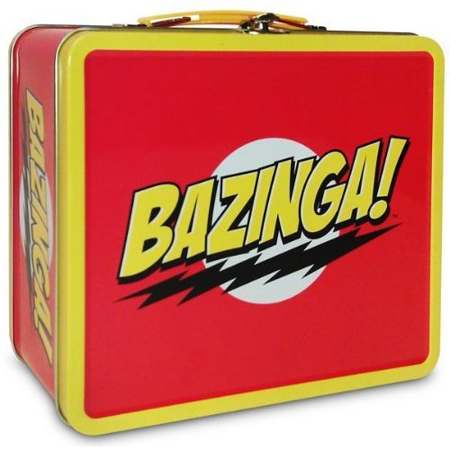 No Bazinga, It's a lunch box. It makes it easier to carry your food to and fro while simultaneously allowing you to display your fandom. The front and back of this box match. The sides match. It says "Bazinga!" all over it. You gotta provide your own thermos. Measures 7 3/4 in. x 6 1/2 in. x 4 in., which means in addition to a stylish lunch accessory, it makes a kind of awesome gift box for one of our Big Bang Theory shirts.