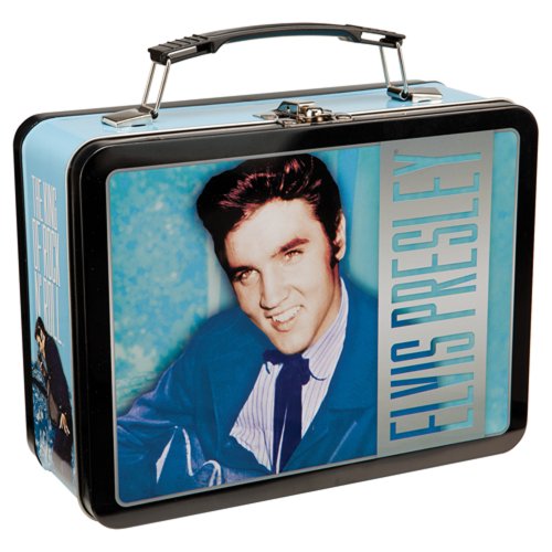 Elvis Presleys immortal legacy was born from his unmistakable voice, charismatic showmanship, and revolutionary fusion of country, blues, gospel, and R and B music. Virtually every rock star from the 50s onward is directly or indirectly indebted to Elvis both for his dance moves and for his embodiment of the rock n roll persona. Elvis truly was The King of Rock n Roll. Elvis products include merchandise, gifts and memorabilia featuring timeless images on mugs, clocks, glasses, plates and more. The Elvis Presley Anniversary Large Tin Tote is great for storing and toting lunches, snacks, supplies, music and gear. It has a collapsible plastic handle and metal latch closure to keep contents secure. The 9 by 3.5 by 7.5-inch box features a classic and colorful image of The King and is the perfect gift for all Elvis fans.